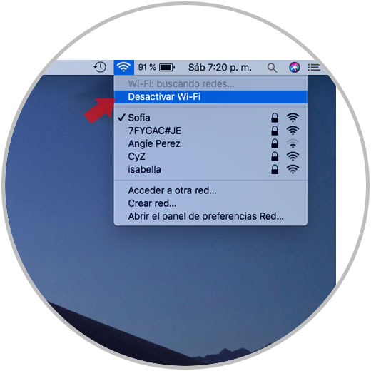 Para esto debemos cerrar toda aplicación que esté usando los servicios de red y posterior a esto desactivar la red Wi-Fi actual pulsando sobre el ícono de Wi-Fi ubicado en la parte superior de la pantalla y en las opciones desplegadas seleccionar "Desactivar Wi-Fi":