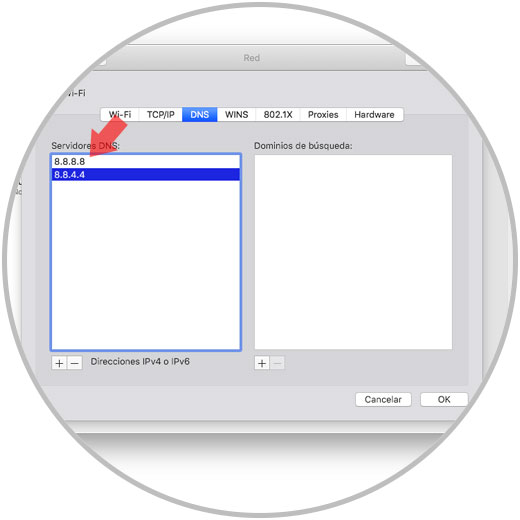 Ahora, vamos a la pestaña DNS y pulsamos sobre el ícono " + " y allí vamos a agregar las siguientes direcciones IP públicas, las cuales son de Google y están habilitadas para ser usadas de forma gratuita como servidores de DNS: