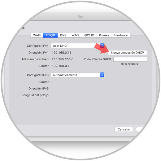 En la nueva ventana desplegada vamos a la pestaña TCP/IP, allí pulsamos en el botón "Nueva concesión DHCP" con el fin de que la dirección IP asignada a nuestro equipo pueda ser renovada de manera automática e inmediata: