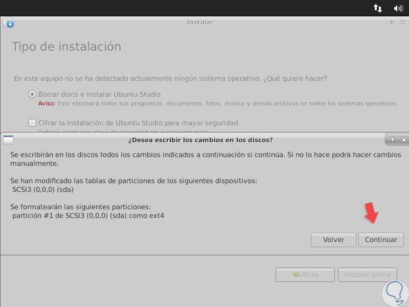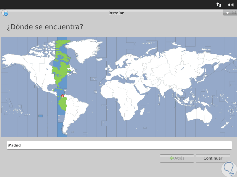 Allí pulsamos en Continuar para escribir los cambios en el disco. A continuación, seleccionamos nuestra ubicación geográfica: