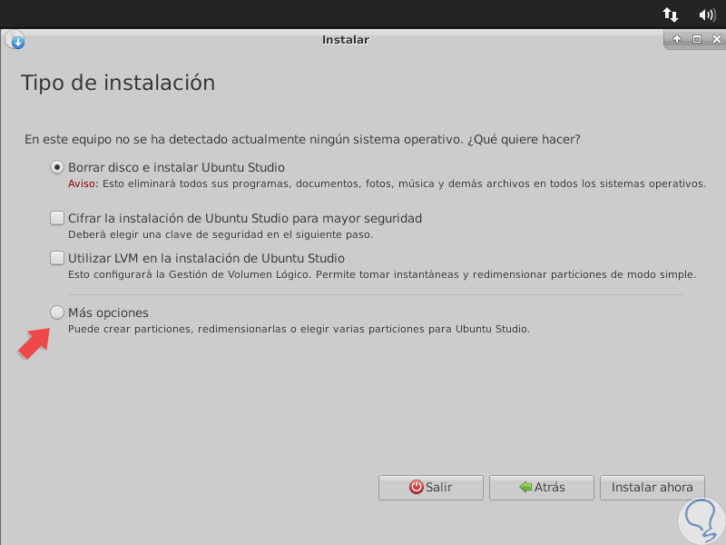 - Activar la casilla “Más opciones” si deseamos crear particiones o asignar espacios para swap, root, etc.