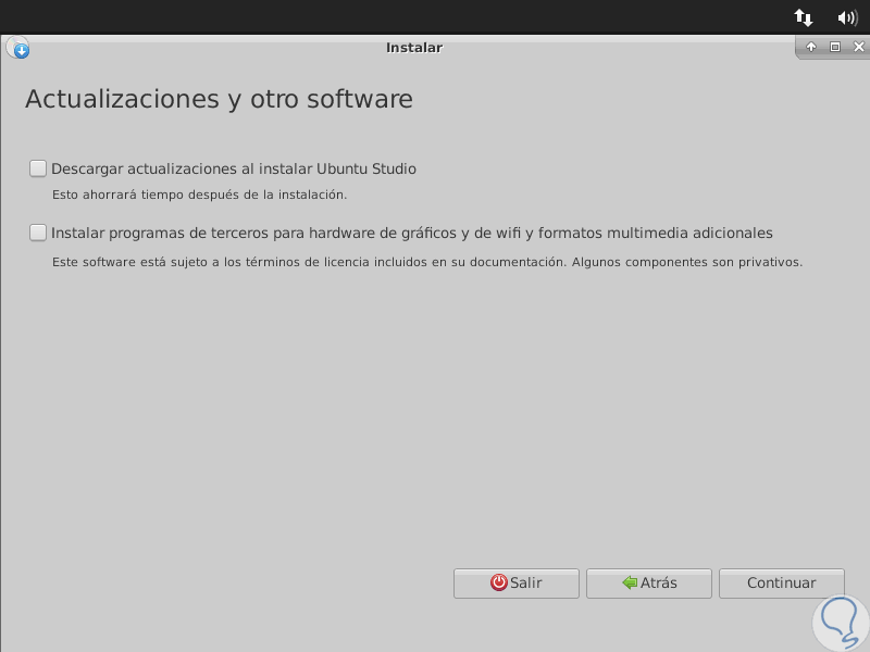Allí podremos desmarcar las casillas que deseemos para que ese paquete no sea instalado, al pulsar en “Continuar” contaremos con las siguientes opciones: