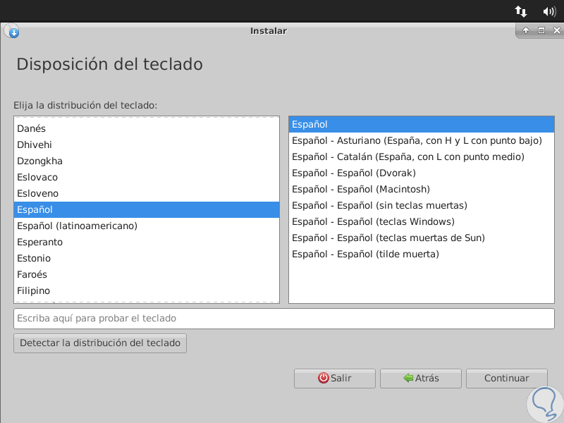 Pulsamos en el botón “Continuar” y a continuación definimos el idioma y disposición del teclado a usar: