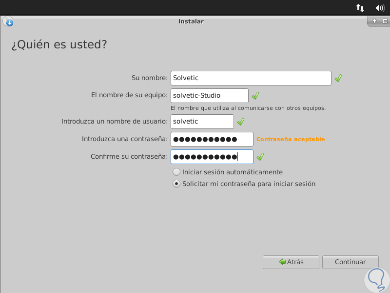 Pulsamos en “Continuar” y ahora definiremos el usuario y contraseña para Ubuntu Studio: