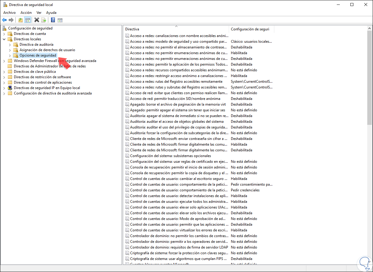 Allí vamos a la sección “Configuración de seguridad / Directivas locales / Opciones de seguridad” y en el costado derecho podremos encontrar una serie de directivas de toda índole con su respectivo estado actual: