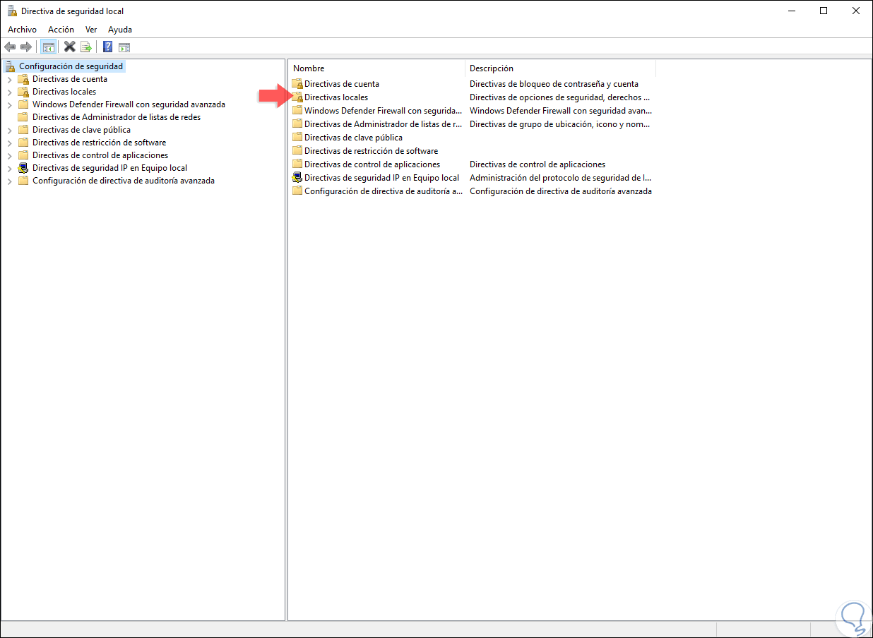 Pulsamos Enter o Aceptar y este será el entorno que veremos de la utilidad secpol en Windows 10: