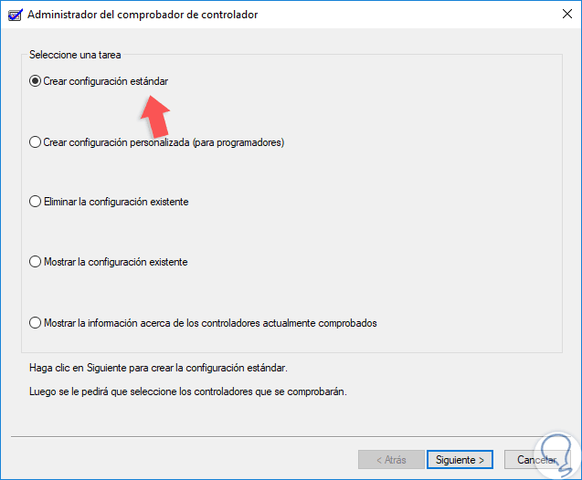 En este caso la configuración estándar de Driver Verifier nos brinda una serie de opciones que son: