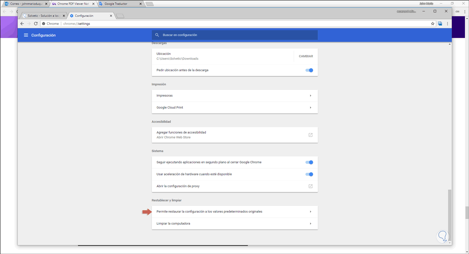 7. Resetear Google Chrome para solucionar error PDF en Chrome