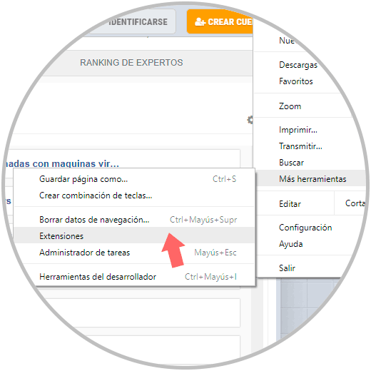Allí podremos intentar abrir archivos PDF y si estos son abiertos de forma normal podemos empezar a descartar que complementos están causando la falla, para ello, en la ventana de incognito, vamos a la ruta “Menú / Mas herramientas / Extensiones”: