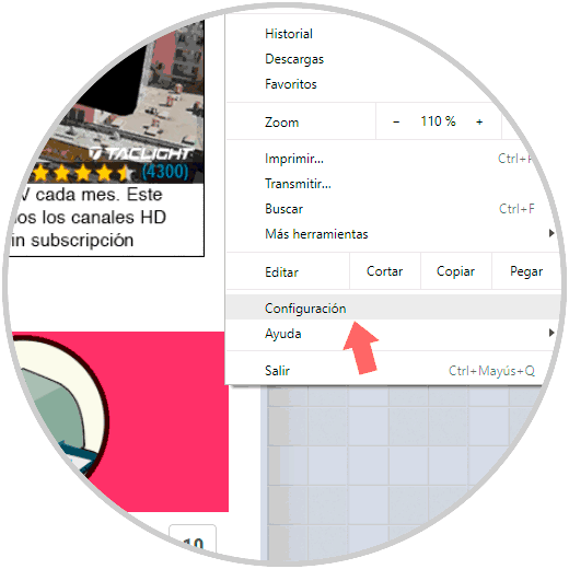 Abrimos Google Chrome y pulsamos en el icono de “Personaliza y controla Google Chrome” y en la lista desplegada seleccionamos “Configuración”: