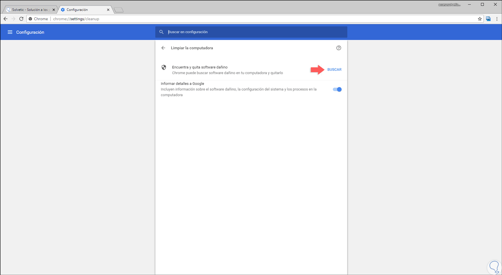 Allí pulsamos en la línea “Buscar” y veremos que inicia el proceso de análisis del equipo. Una vez que finalice este proceso, podemos llevar a cabo las indicaciones en pantalla, si existe algún software malicioso, y con ello el visor de PDF de Chrome funcionará de la forma esperada.