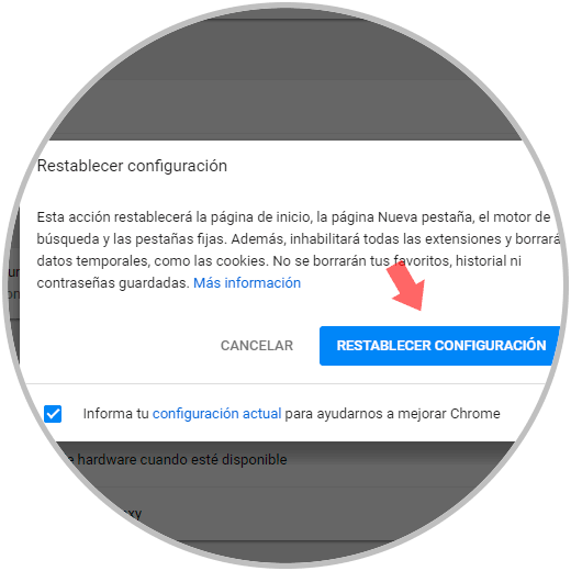 Al pulsar allí será desplegado lo siguiente. Allí pulsamos en el botón “Restablecer configuración” para llevar a cabo el proceso.