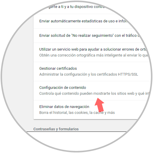 Ahora, en la sección “Privacidad y seguridad” daremos clic en la opción “Configuración de contenido”: