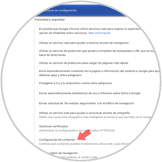 En la ventana desplegada vamos a la parte inferior y pulsamos en "Avanzada". Allí vamos a la sección "Privacidad y seguridad" y pulsamos en la categoría "Configuración de contenido":