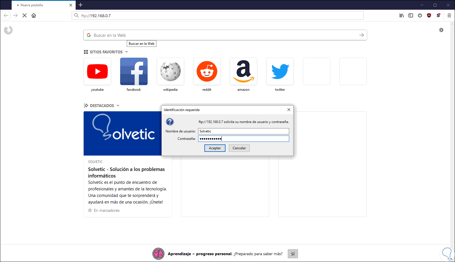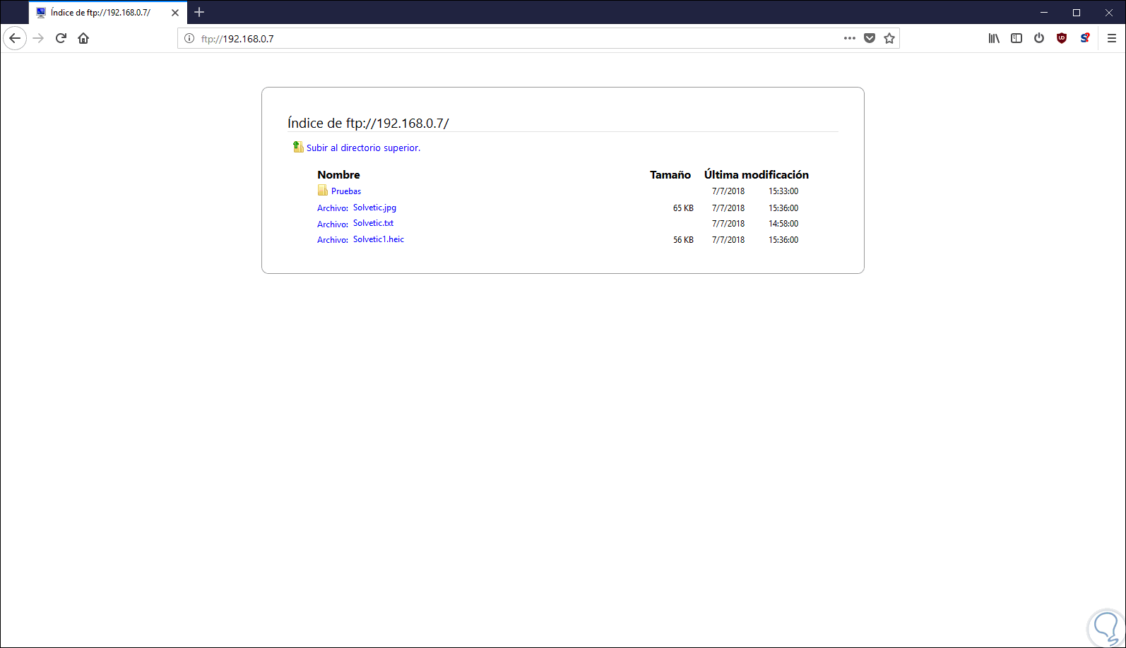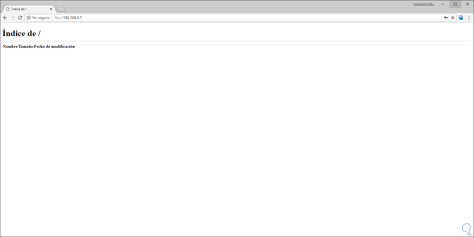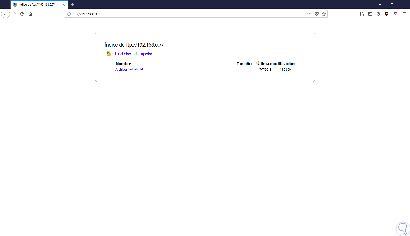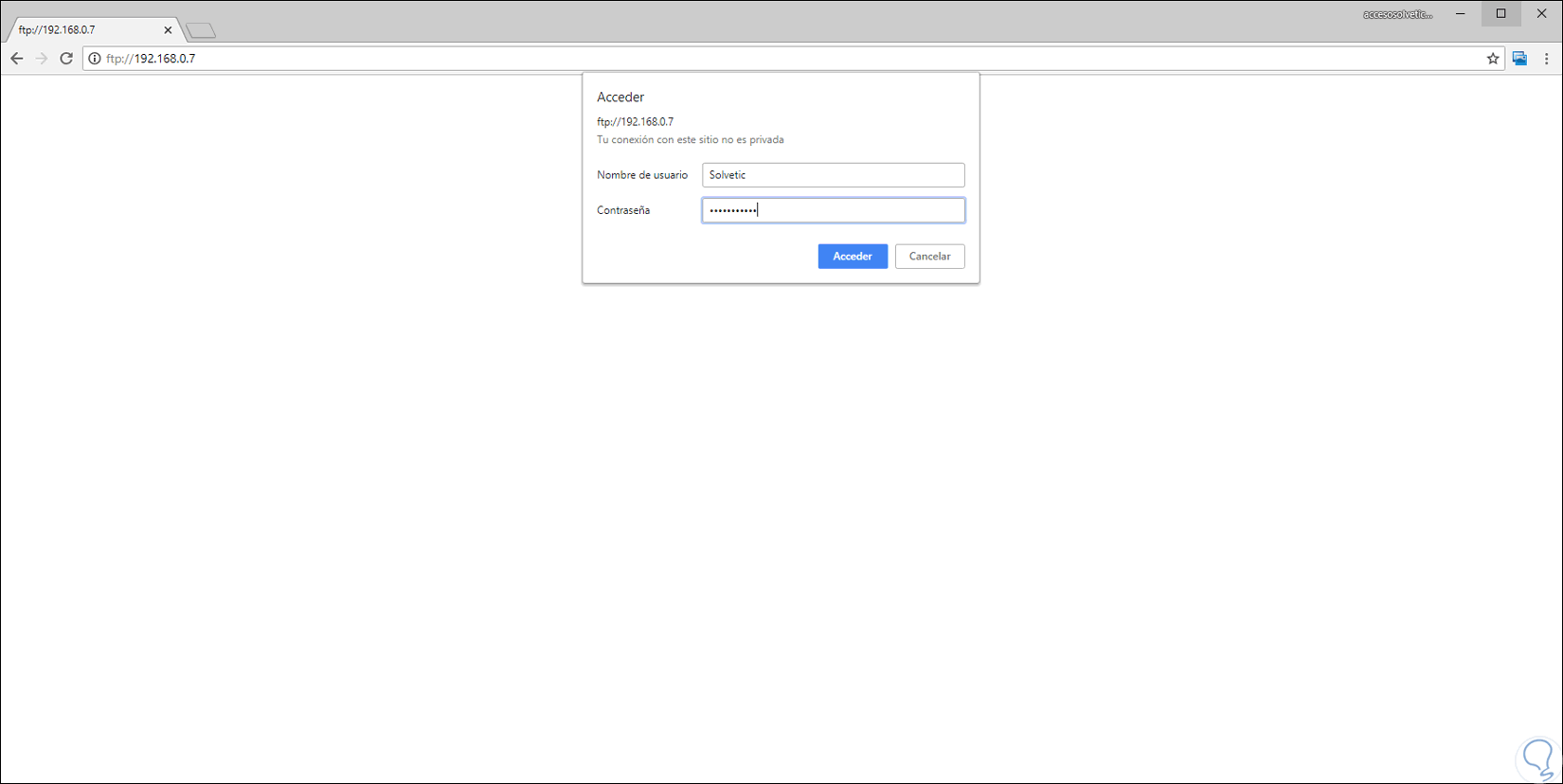 Pulsamos en Aceptar para aplicar los cambios. Una vez se hayan completado estos pasos, será posible acceder al servidor FTP desde la red local. Para verificar esta conexión, vamos a algún navegador e ingresamos la siguiente sintaxis: