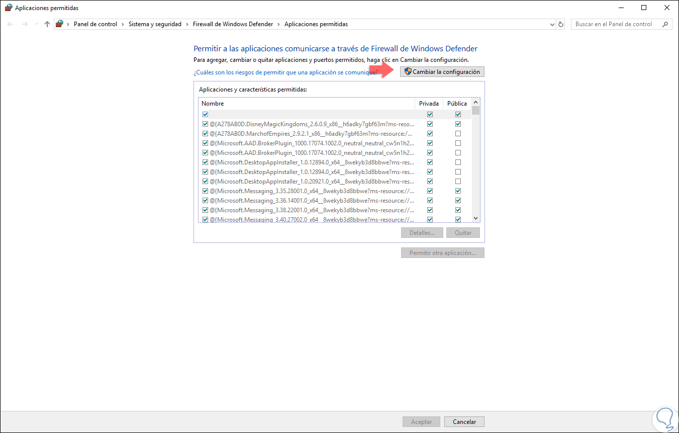 Allí damos clic en la línea “Permitir una aplicación a través de firewall” y será desplegada la siguiente ventana: