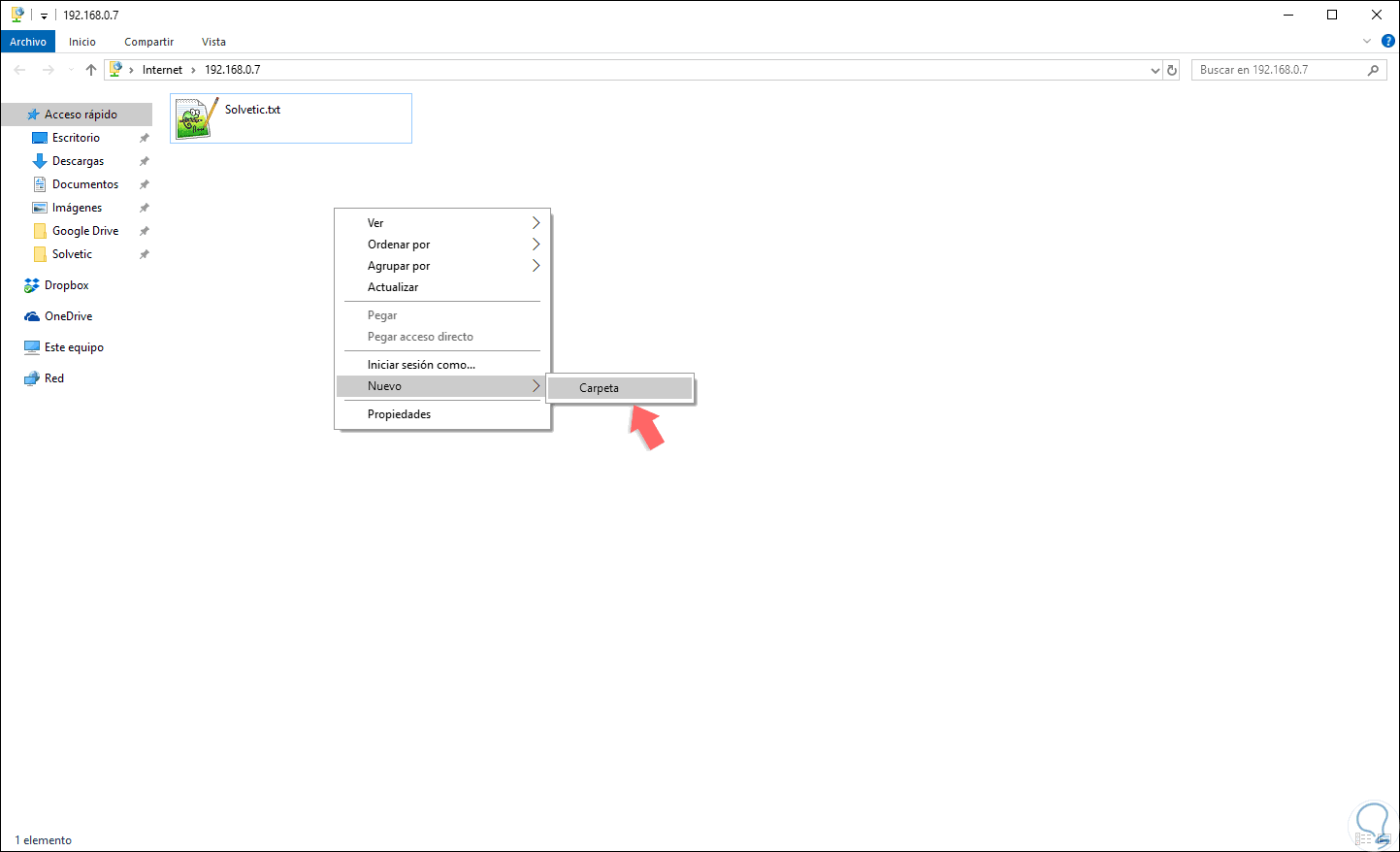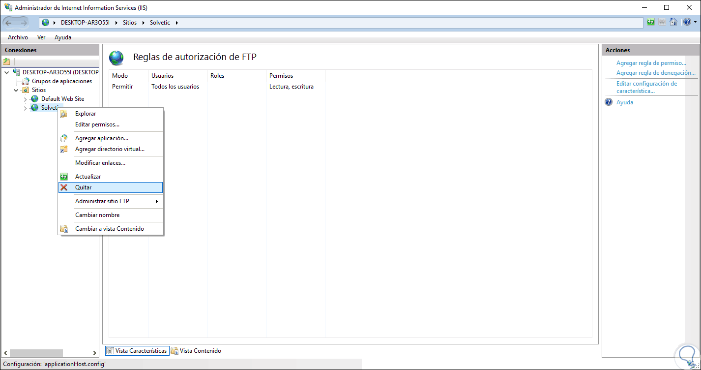 Para realizar diversas acciones sobre el servidor FTP en Windows 10 basta con dar clic derecho sobre el servidor y allí llevar a cabo acciones como: