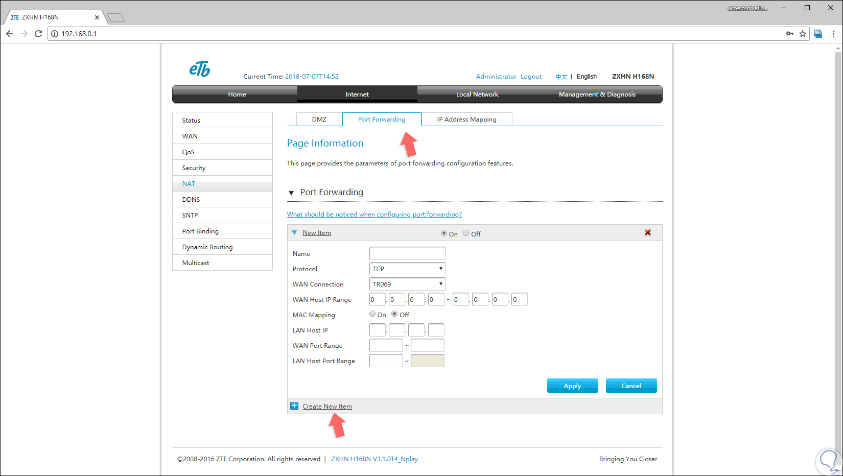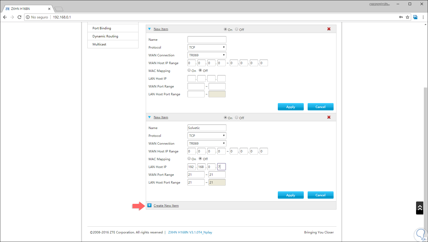 Allí damos clic en la línea “Create new ítem” y allí definiremos los siguientes valores. Pulsamos en el botón “Apply” para guardar los cambios.