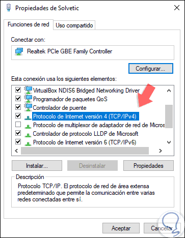 En la ventana desplegada ubicamos la línea “Protocolo de Internet versión 4” y damos clic en el botón “Propiedades”: