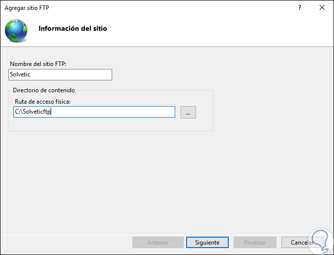 En este último punto se recomienda crear una carpeta en la raíz de la unidad del sistema operativo, normalmente la unidad C, o en un disco duro diferente, ya que, si se configura la carpeta de inicio como una de las carpetas predeterminadas para FTP, al agregar varias cuentas los usuarios no tendrán los permisos necesarios para acceder a la ruta FTP.