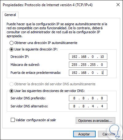 En la nueva ventana activamos la casilla “Usar la siguiente dirección IP” y allí ingresamos la IP a usar, así como la puerta de enlace predeterminada, la máscara de red se creará automáticamente. Pulsamos en Aceptar para aplicar los cambios.