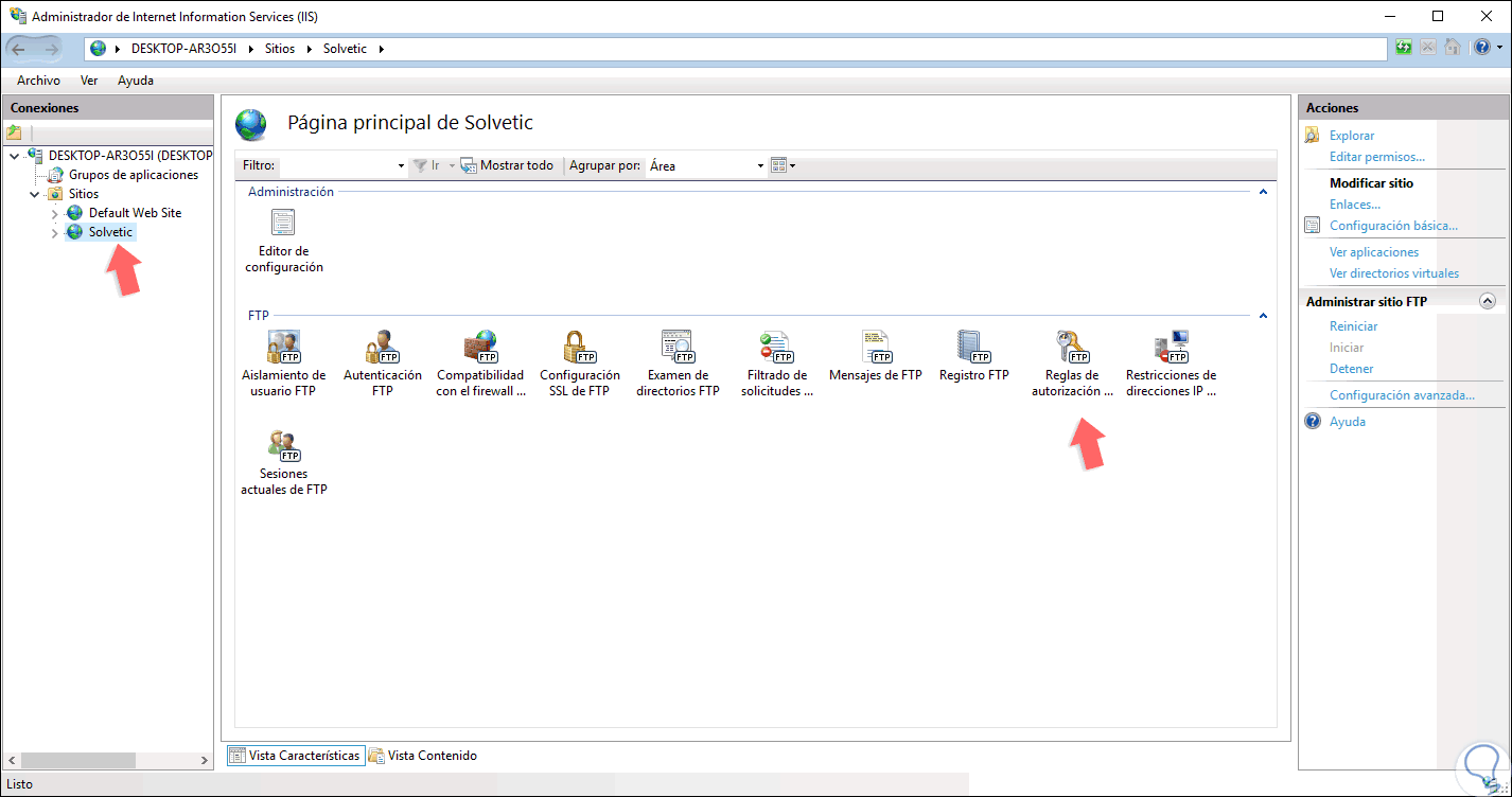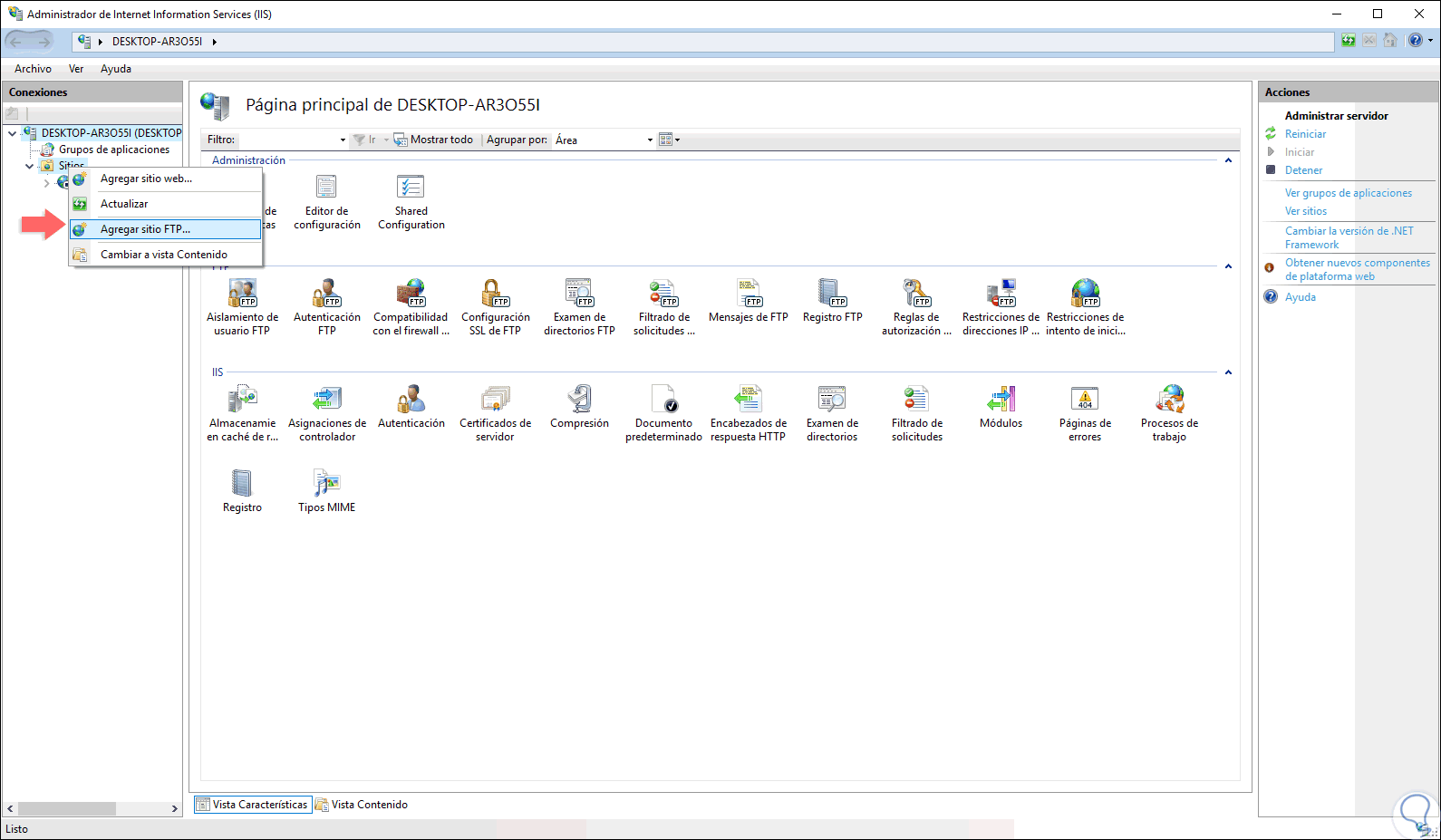 Una vez realizado esto, vamos a crear un nuevo sitio FTP, configurar las reglas de firewall y permitir las conexiones externas lo cual es vital en cualquier conexión FTP. En primer lugar, vamos a crear nuestro sitio FTP y para ello vamos a la siguiente ruta: