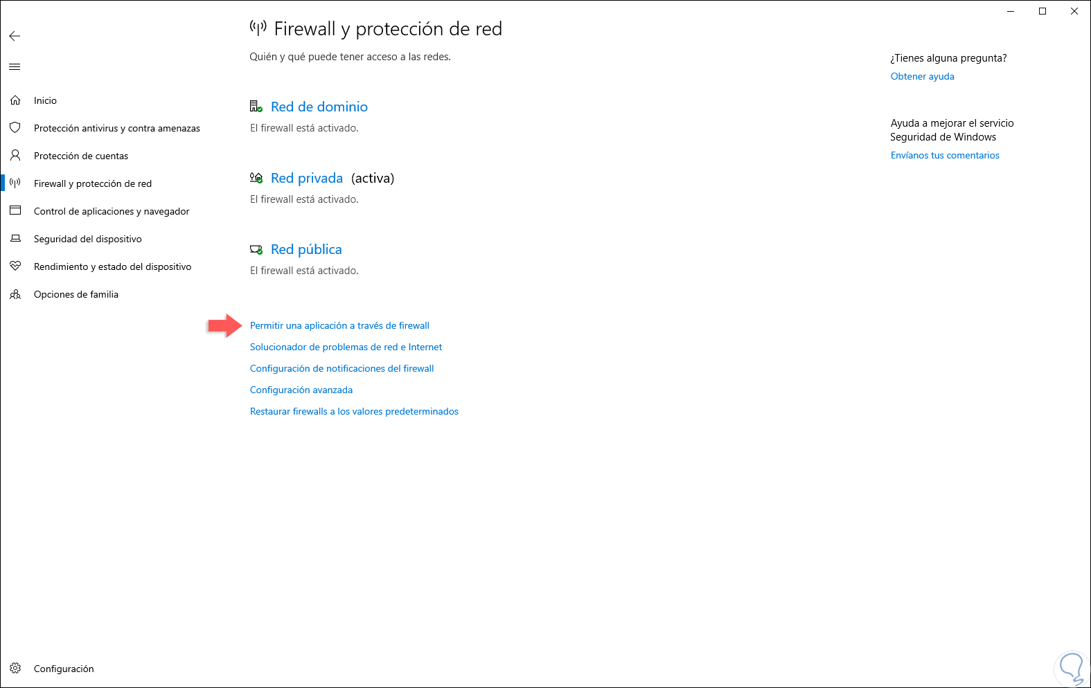 Para permitir las conexiones al FTP en Windows 10, vamos a la utilidad “Seguridad de Windows” y allí vamos a la sección “Firewall y protección de red” donde veremos lo siguiente: