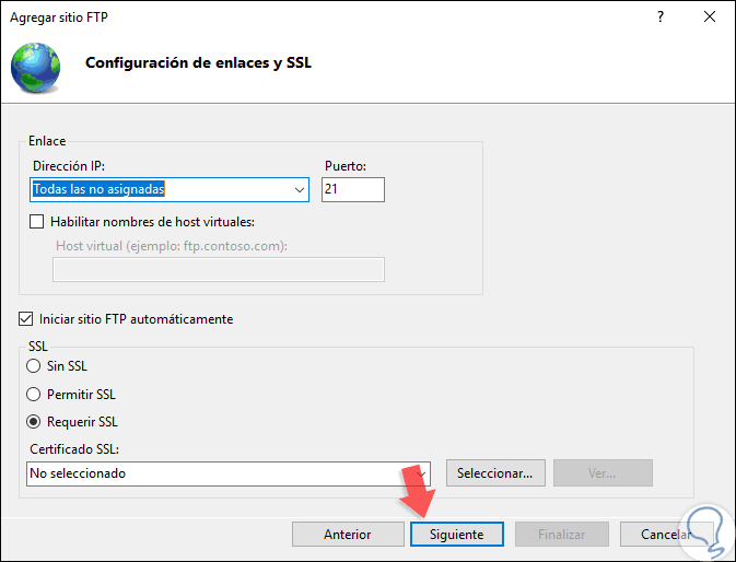 Allí podemos establecer un rango de direcciones IP, puertos a usar, ejecutar FT automáticamente o definir los valores de seguridad SSL, podemos dejar los valores por defecto, o si deseamos activar la casilla “Sin SSL” para evitar conflictos de permisos, y pulsar de nuevo en “Siguiente”. Pulsamos en Siguiente y veremos la siguiente ventana: