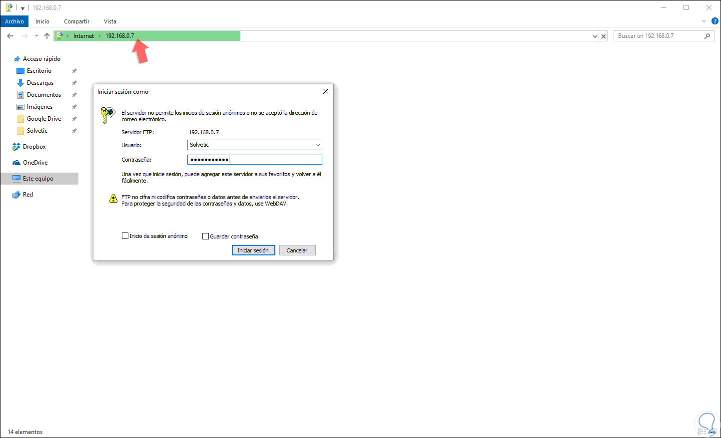Ahora para que los usuarios puedan conectarse desde una red externa, podrán usar algún navegador como Internet Explorer, Firefox o Chrome y en una nueva ventana anteponer ftp:// seguida de la dirección IP del servidor, veremos que será necesario ingresar las respectivas credenciales: