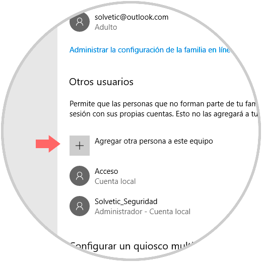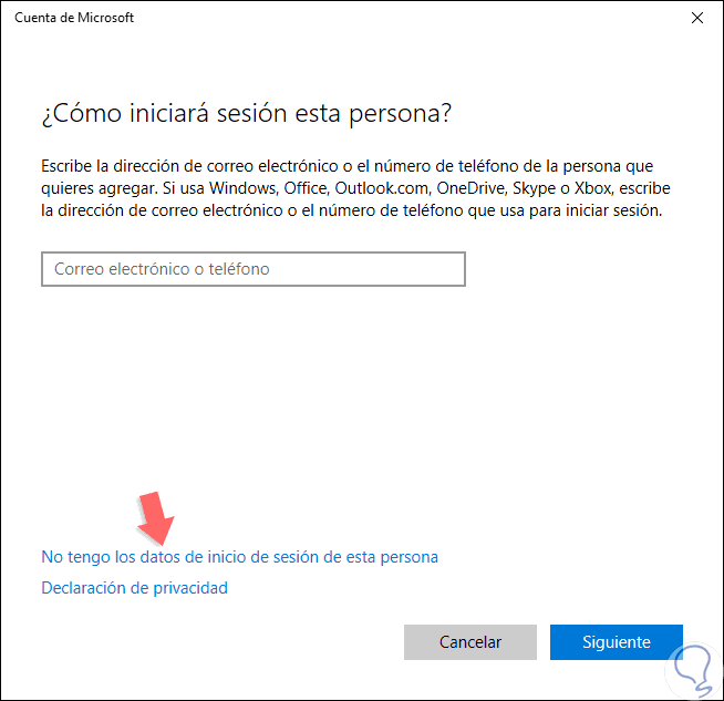 Allí damos clic en la línea “Agregar otra persona a este equipo” y será desplegado el siguiente asistente. Allí debemos ingresar la cuenta de Microsoft del usuario deseado o bien pulsar en la línea “No tengo los datos de inicio de sesión de esta persona” para crear una cuenta local y seguir los pasos del asistente.