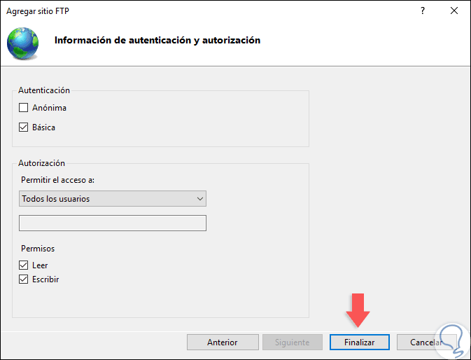 - “Permitir el acceso a”, allí debemos definir que usuarios tendrán acceso al FTP, las opciones a usar son Todos los usuarios, Usuarios anónimos, Roles o grupos de usuarios especificados y Usuarios especificados
