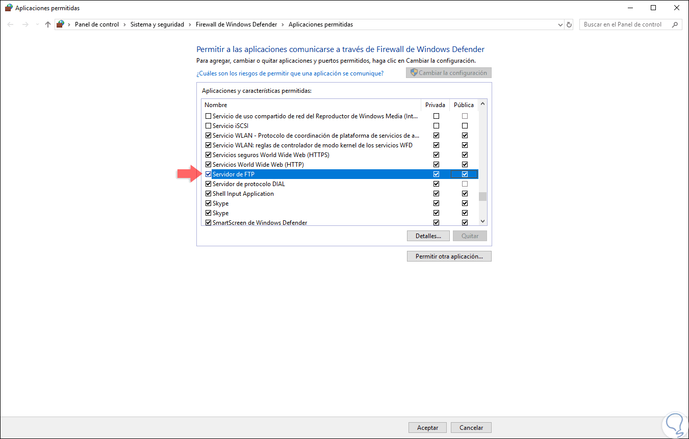 Este es un punto fundamental ya que por defecto el Firewall integrado de Windows 10 bloqueará las conexiones FTP al considerarlas una amenaza de seguridad y al intentar conectarnos se generará un error de acceso.