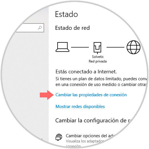 Allí damos clic en la categoría “Red e Internet” y en la sección “estado” damos clic en la línea “Cambiar las propiedades de conexión”: