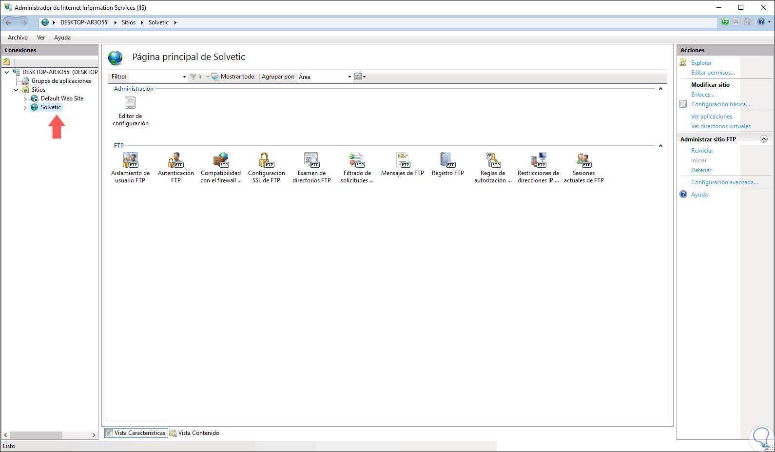 Allí damos doble clic en la línea “Administrador de Internet Information Services (IIS)”, y en la nueva ventana desplegada vamos a la sección “Conexiones” y allí damos clic sobre el sitio FTP que hemos creado: