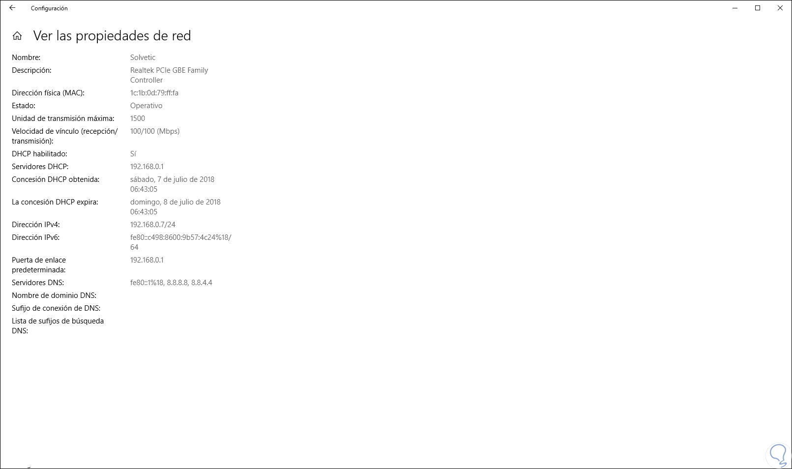 Al dar clic allí debemos tener presente la dirección IP en la línea “Puerta de enlace predeterminada”: