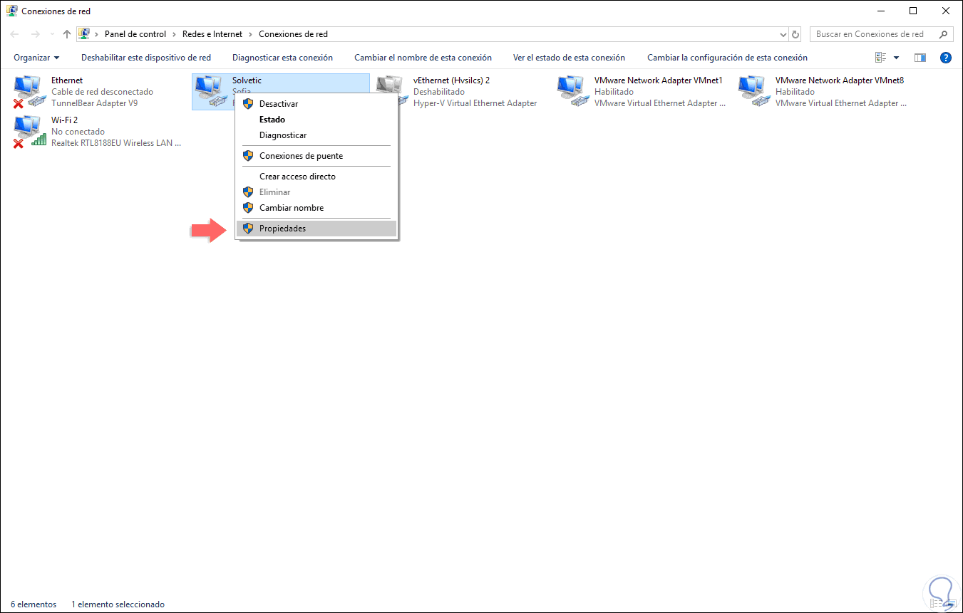Allí daremos clic derecho sobre el adaptador de red actual de Windows 10 y seleccionamos la opción “Propiedades”: