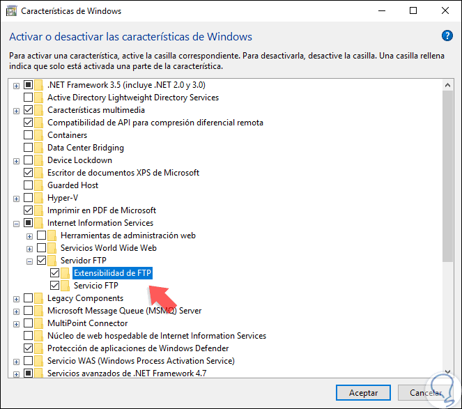Allí damos clic en la línea “Activar o desactivar las características de Windows” y en la ventana emergente vamos a la sección “Internet Information Services” donde desplegamos a su vez la sección “Servidor FTP” y allí activamos las siguientes casillas: