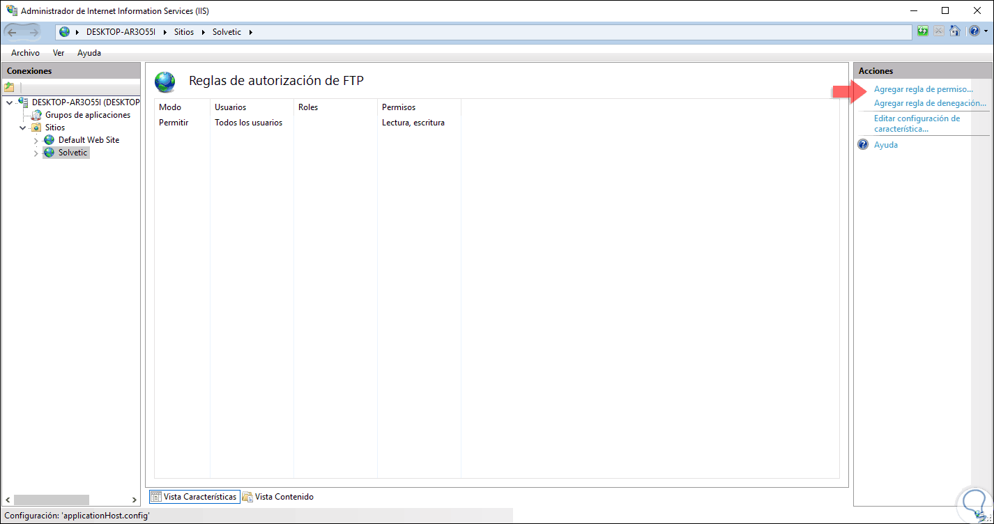 Daremos doble clic en la opción “Reglas de autorización de FTP” y será desplegado lo siguiente:
