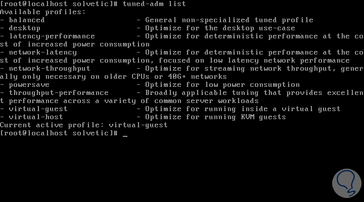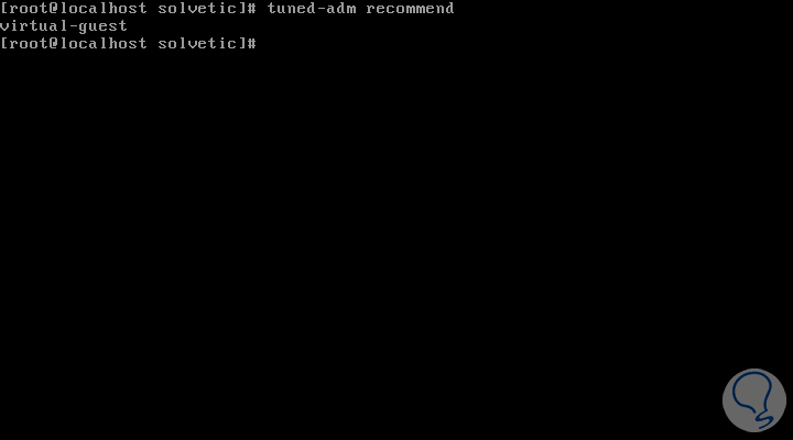 Un perfil se establece automáticamente como predeterminado tomando como base la función del producto en uso y será posible hacer uso del comando tuned-adm recommend para determinar qué perfil recomienda CentOS 7 como ideal para el servidor usado.