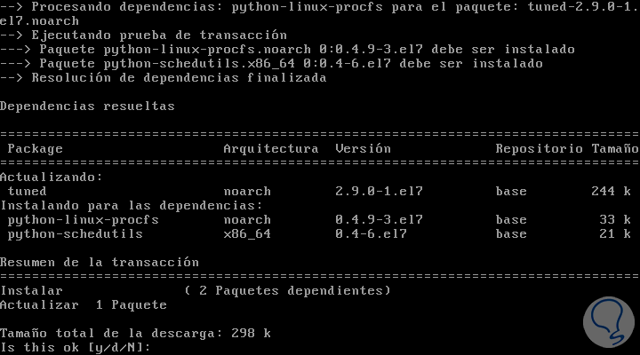 Ingresamos la letra y para confirmar la descarga e instalación de tuned en CentOS 7.