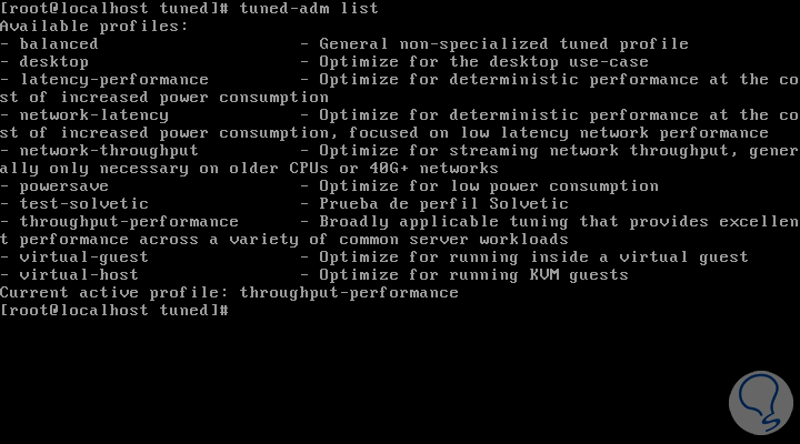 Si deseamos cambiar a alguno de los perfiles disponibles, por ejemplo, para usar el perfil throughput-performance, el cual optimiza las cargas de trabajo del servidor para obtener un alto rendimiento, para llevar a cabo este cambio vamos a ejecutar lo siguiente: