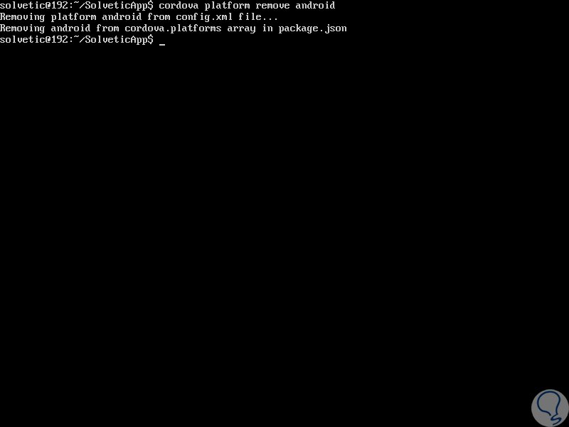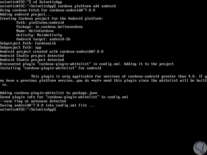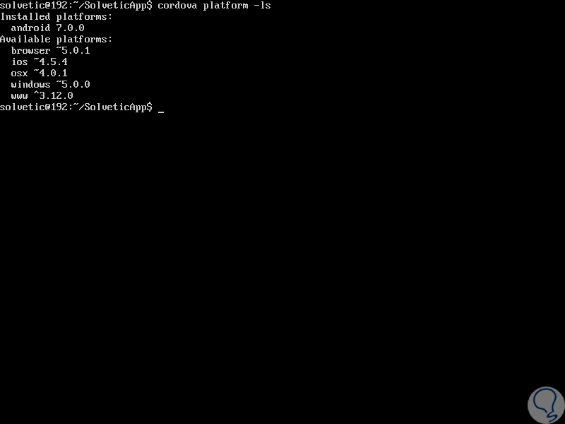 Ahora vamos a ir al directorio de la nueva aplicación, SolveticApp y allí agregamos la plataforma requerida para la aplicación: