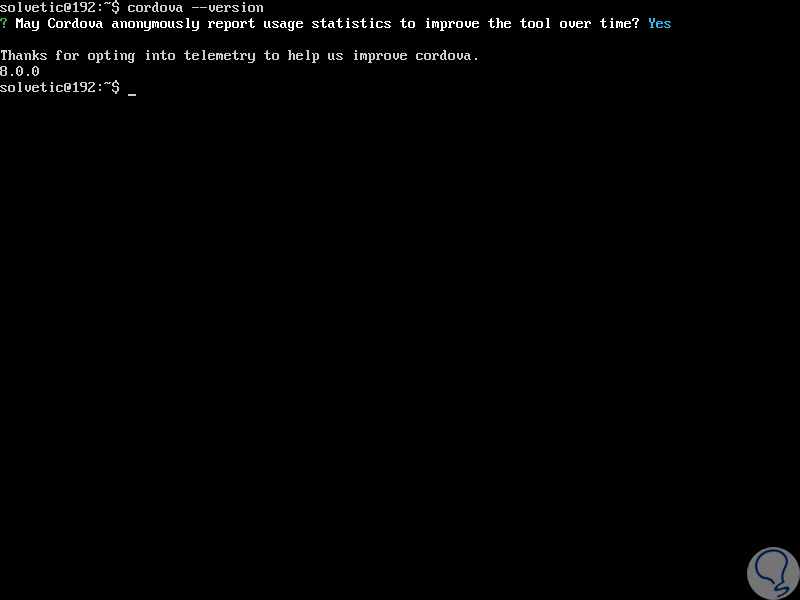 Ahora vamos a verificar la versión de Apache Cordova ejecutando la siguiente línea.