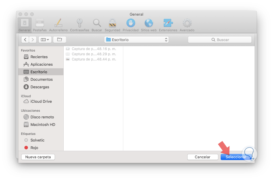 Ahora, en la ventana desplegada vamos a la nueva ubicación donde serán guardadas las descargas de Safari en macOS Mojave y pulsamos en el botón "Seleccionar" ubicado en la parte inferior de la ventana: