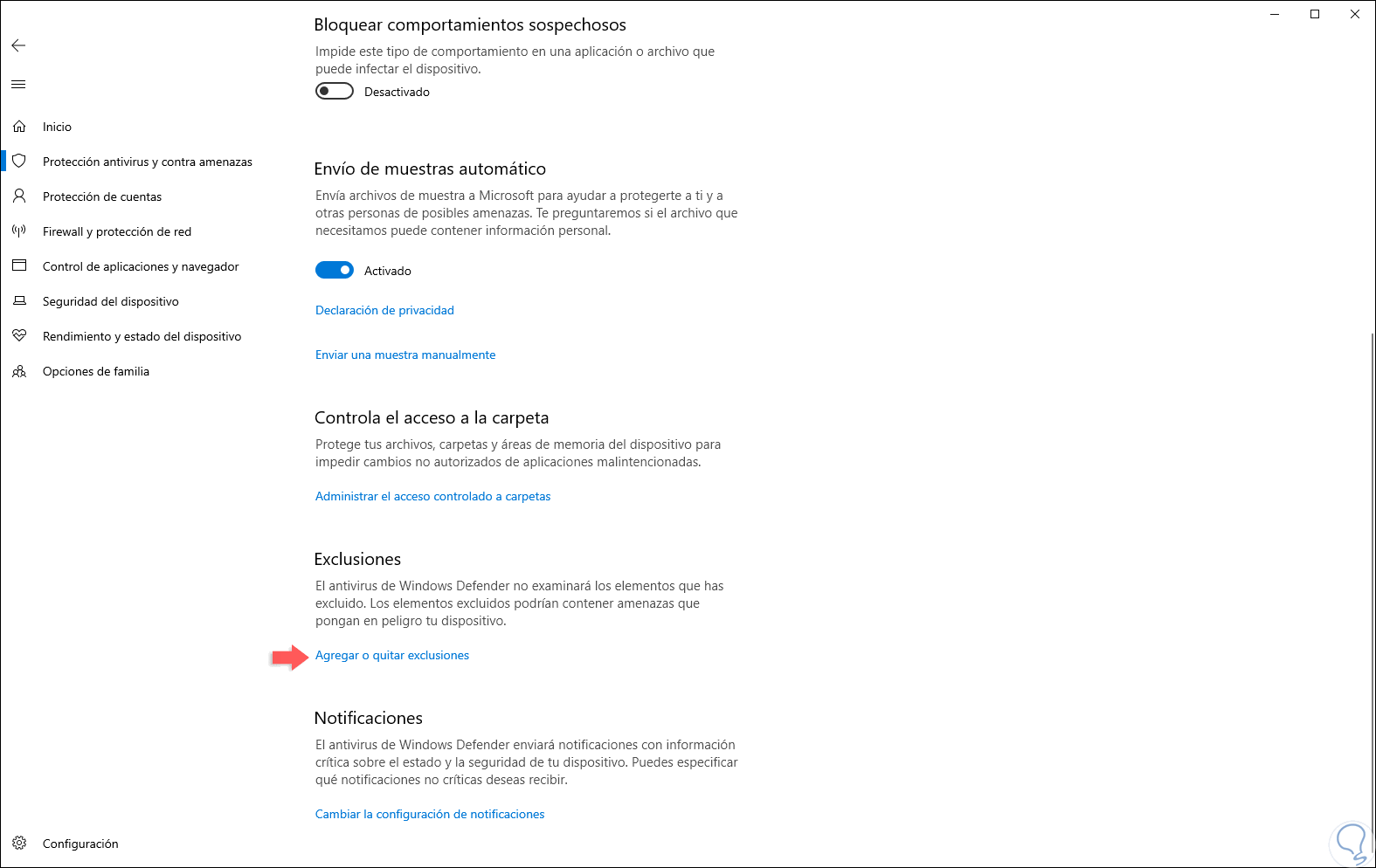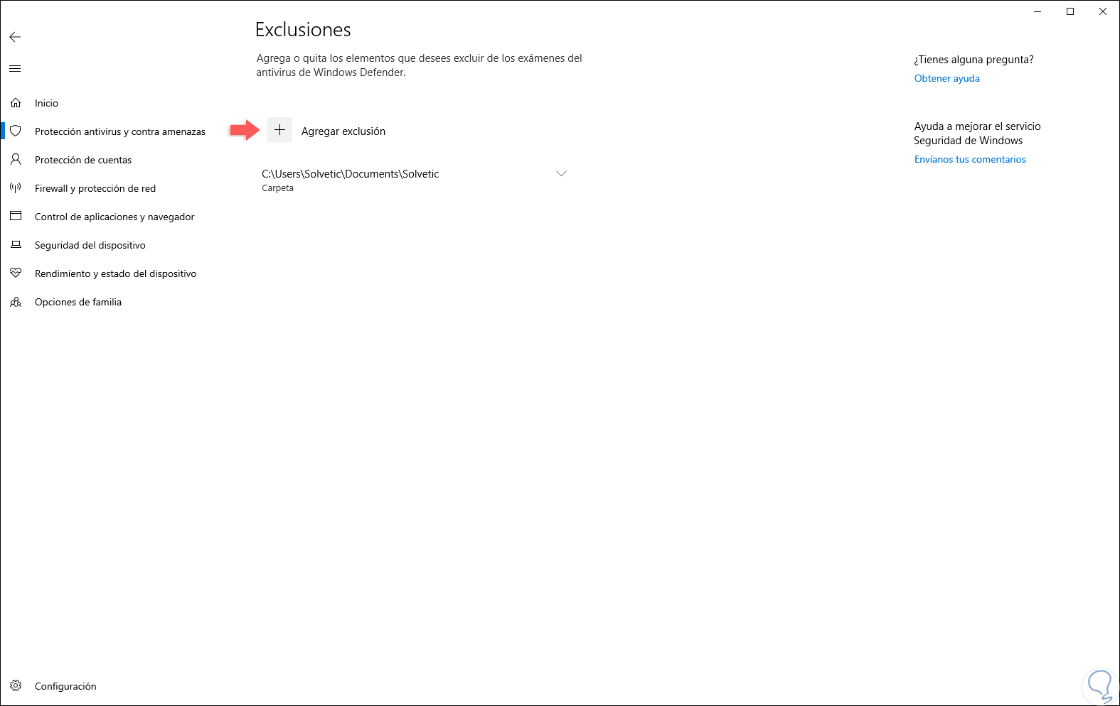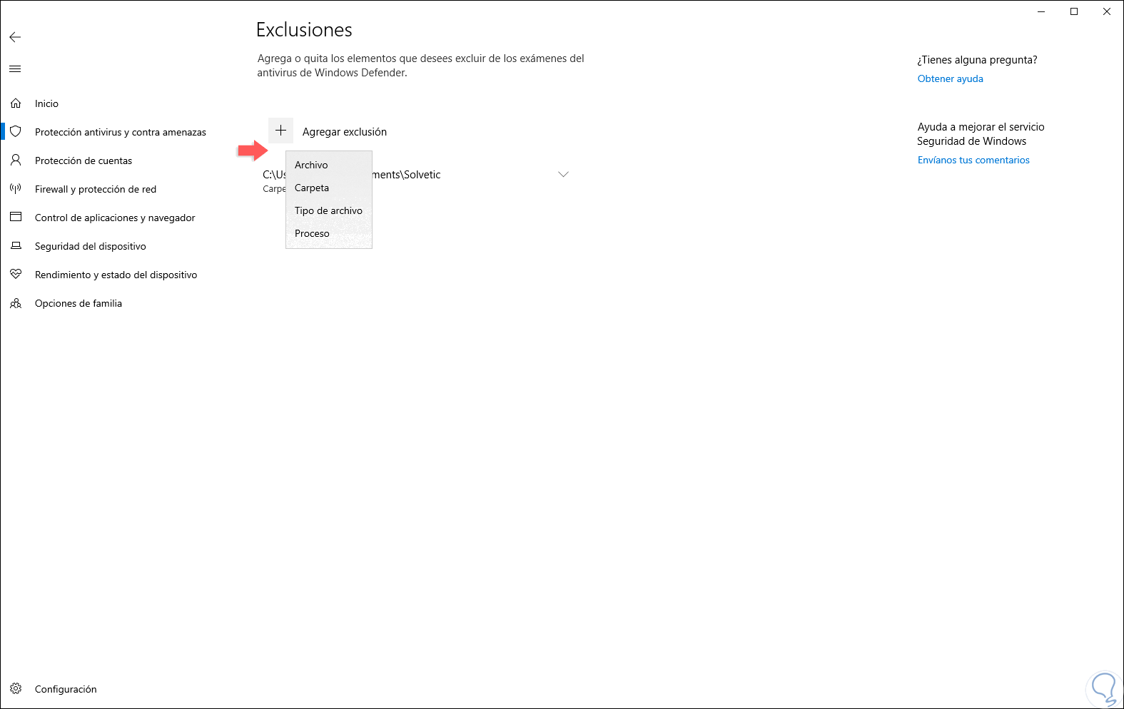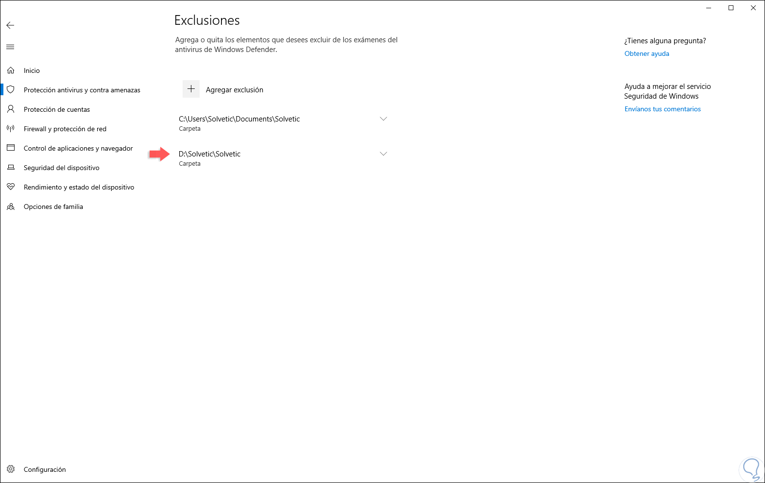 En la nueva ventana desplegada vamos a la sección “Exclusiones” donde veremos lo siguiente: