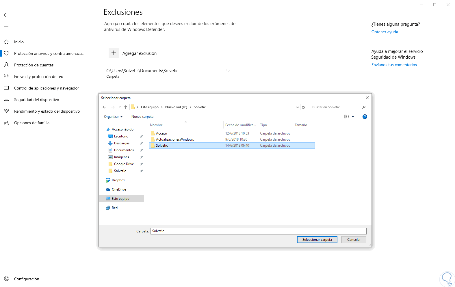 Para este caso vamos a excluir una carpeta, para ello pulsamos en la línea “Carpeta” y será desplegada la ventana emergente a donde debemos seleccionar la carpeta que deseamos excluir en Windows Defender: