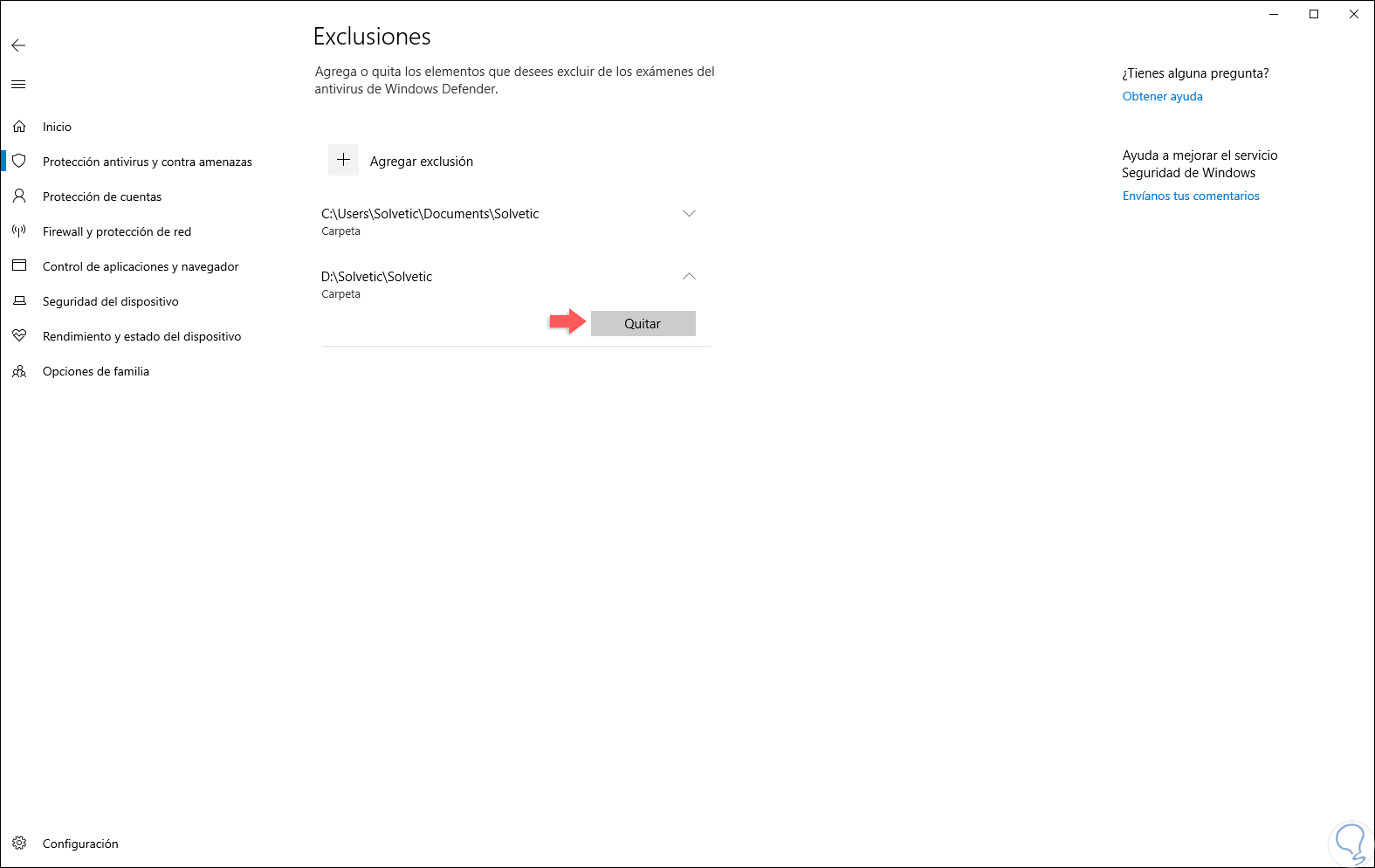 En el momento en que deseemos eliminar algún elemento excluido en Windows Defender, basta con pulsar en el icono lateral de cada elemento y allí pulsar en el botón “Quitar”: