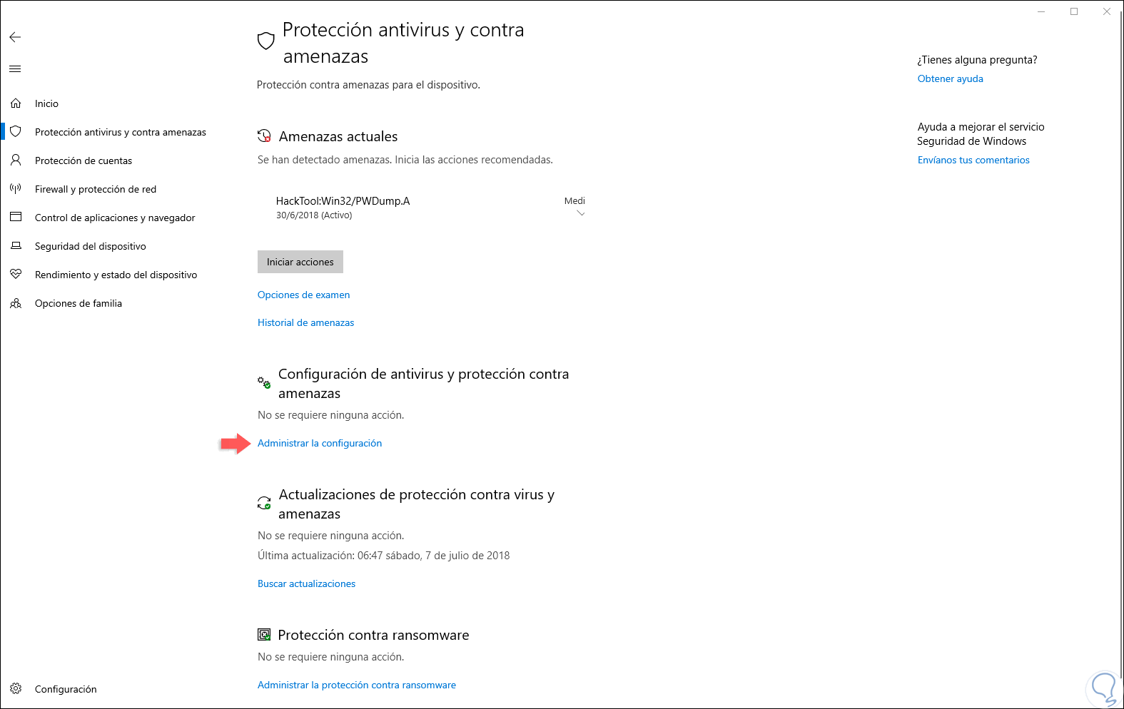 En la ventana desplegada vamos a la sección “Protección antivirus y contra amenazas” y damos clic en la línea “Administrar la configuración” ubicada en la sección “Configuración de antivirus y protección contra amenazas”:
