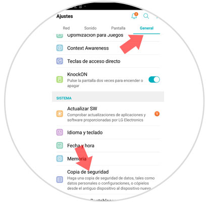 Ahora en la barra superior pulsa en el apartado “General” y después en la opción “Copia de Seguiridad en el listado”