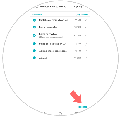 Ahora en la nueva pantalla selecciona todos aquellos aspectos que quieres que queden guardados en la copia de seguridad marcándolos con el check azul, y cuando estén todos los que necesitas pulsa en “Iniciar” ubicado en la esquina inferior izquierda de la pantalla.